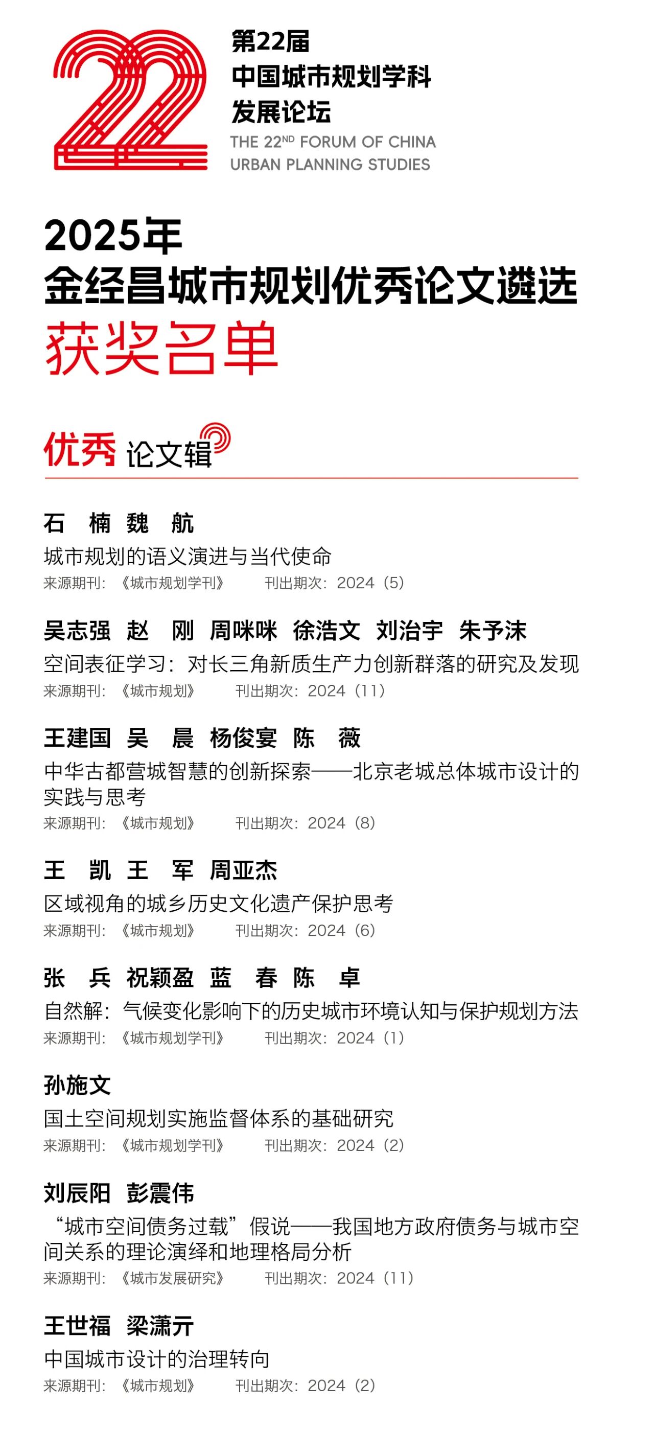 2025年10月25日,第22届“中国城市规划学科发展论坛”上将为论文作者颁发证书。各杂志将在最近出版的期刊中公布获奖名单。